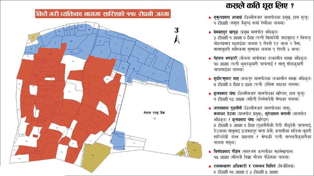 कान्तिपुरलाई प्राप्त विवरणअनुसार डिल्लीबजार मालपोतका तत्कालीन प्रमुख मुकुन्द आचार्यले ससुरा वैकुण्ठ शर्मा रेग्मीका नाममा राणा परिवारबाट १ रोपनी बकस पास गराएका थिए । आचार्यको निधन भइसकेको छ । मालपोतकै अर्का तत्कालीन प्रमुख प्रेमबहादुर खापुङले पत्नी खिमादेवी आङबुहाङ र भिनाजु मोहनप्रसाद भट्टराईका नाममा १ रोपनी १४ आना २ पैसा संयुक्त रूपमा बुझेका थिए । खापुङले बुहारी (सालाकी श्रीमती) शशिकला सुब्बाका नाममा १ रोपनी ३ आना थप जग्गा लिएका थिए ।