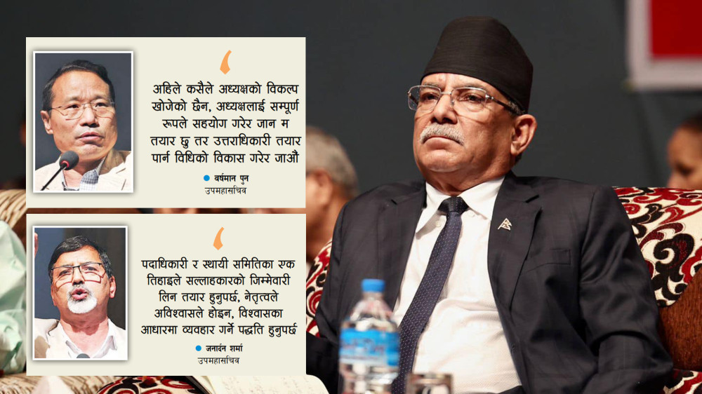 करिब डेढ वर्षपछि बसेको बैठकमा नेताहरूका आलोचना र सुझावलाई अध्यक्ष दाहालले चार दिनदेखि डायरीमा टिपिरहेका छन् । सबै केन्द्रीय सदस्यले बोलिसकेपछि उनले आइतबार त्यसको जवाफ दिनेछन् । बैठकमा शनिबार उपमहासचिव वर्षमान पुनले दाहालको विकल्प तत्काल कसैले नखोजेको बताउँदै उत्तराधिकारी तयार नगरेकामा असन्तुष्टि व्यक्त गरे । उनले उत्तराधिकारी निर्माणको विधि विकास गर्नुपर्ने बताए । ‘अहिले कसैले अध्यक्षको विकल्प खोजेको छैन । अध्यक्षलाई सम्पूर्ण रूपले सहयोग गरेर जान म तयार छु,’ उनले भने, ‘तर उत्तराधिकारी तयार पार्न विधिको विकास गरेर जाऔं ।’
