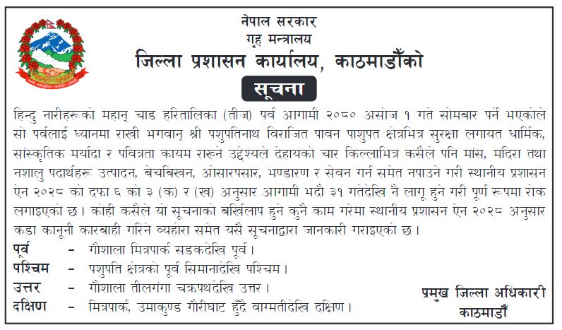 यो क्षेत्रमा मासु, मदिरा तथा नशालु पदार्थहरु उत्पादन, बेचबिखन, ओसारपसार, भण्डारण र सेवन गर्न भदौ ३१ गतेदेखि नै निषेध गरिएको जिल्ला प्रशासन कार्यालय काठमाडौंले जनाएको छ ।
