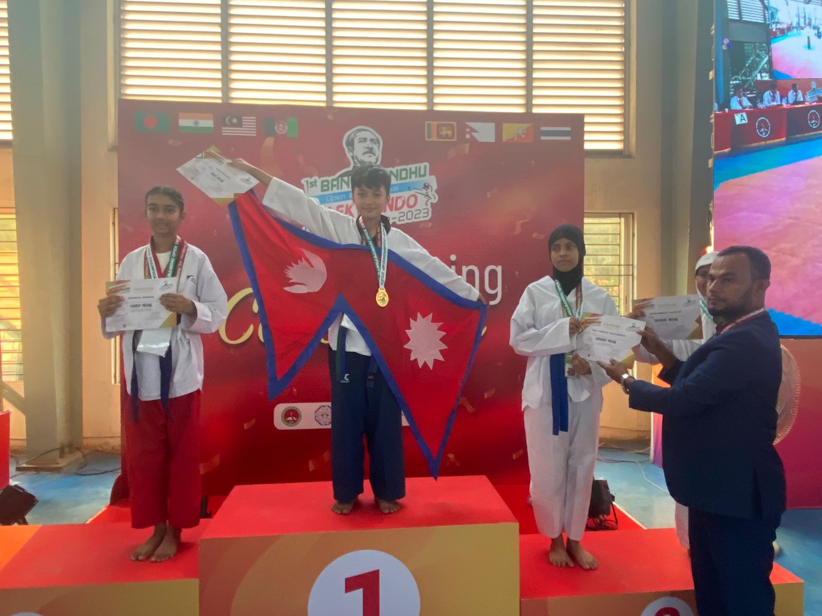 काठमाडौं : नेपालकी आइरा बोहराले बंगलादेशमा आयोजना भएको प्रथम बंगबन्धु इन्टरनेसनल तेक्वान्दो च्याम्पियनसिपमा स्वर्ण पदक जितेकी छन् । शुक्रबारबाट बंगलादेशको ढाकामा सुरु भएको च्याम्पियनसिपमा आइराले क्याडेट १२ मुनिको एकल पुम्सेमा स्वर्ण पदक जितेकी हुन् । आइरा स्वयम्भू तेक्वान्दो डोजाङकी खेलाडी हुन् ।