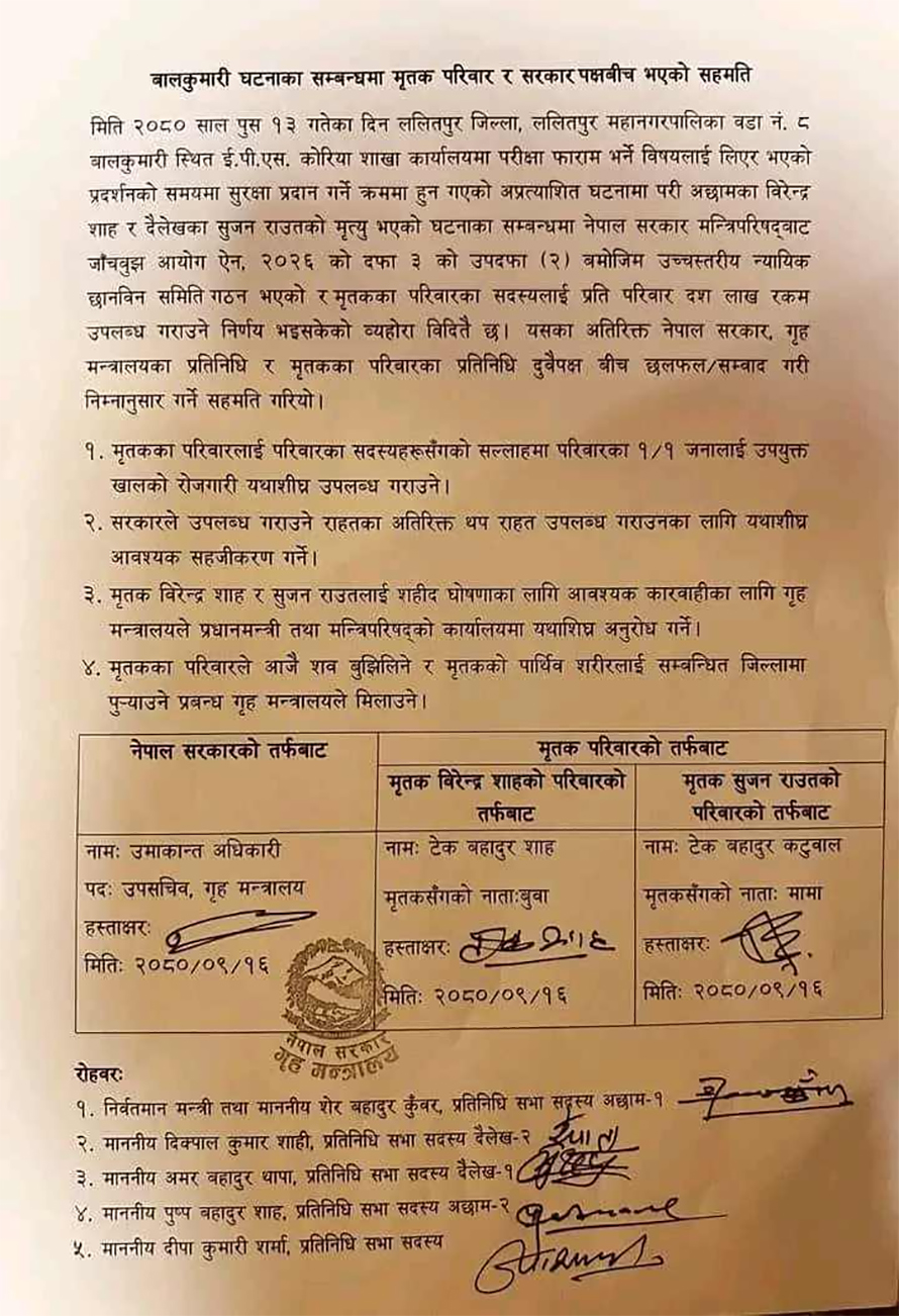 सम्बन्धित जिल्लाका निर्वाचन क्षेत्रमा सांसदहरुको रोहबरमा सरकारको तर्फबाट गृह मन्त्रालयका उपसचिव उमाकान्त अधिकारी र मृतकको परिवारका तर्फबाट वीरेन्द्र शाहका बुवा टेकबहादुर शाह, सुजनका मामा टेकबहादुर कटुवालले सहमपित्रमा हस्ताक्षर गरेका छन् ।
