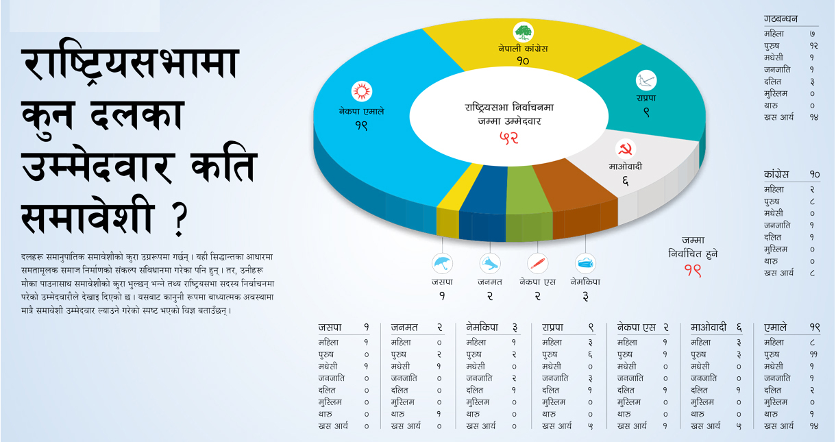 एमालेका १९ उम्मेदवारमध्ये महिला ८, पुरुष ११ जना छन्। जसमध्ये मधेसी २, दलित २, जनजाति १, खसआर्य १८ छन्। थारु र मुस्लिम छैनन्। राप्रपाका ९ जनामध्ये पुरुष ६ र महिला ३ जना छन्। यीमध्ये दलित १, जनजाति ३, खसआर्य ५ जना छन्। मुस्लिम, थारु छैनन्।