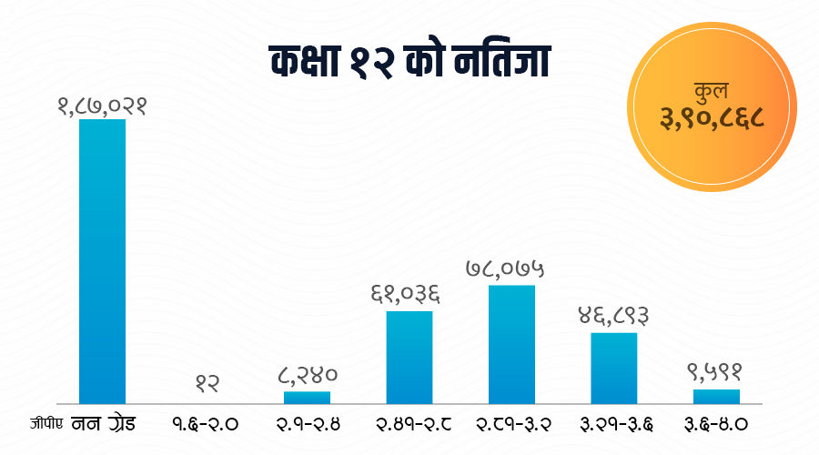 निमित र ग्रेडवृद्धि गरी कुल चार लाख ७८ हजार ३८९ परीक्षार्थीमध्ये २ लाख ३१ हजार २३५ जना उत्तीर्ण भएका छन् । यस पटक ९ हजार ५९१ जनाले ३.६१ देखि ४ जीपीए ल्याएका छन् । सबभन्दा धेरै ७८ हजार ७५ जनाले २.८१ देखि ३.२० जीपीए ल्याएको परीक्षा नियन्त्रण कार्यालयले जनाएको छ ।