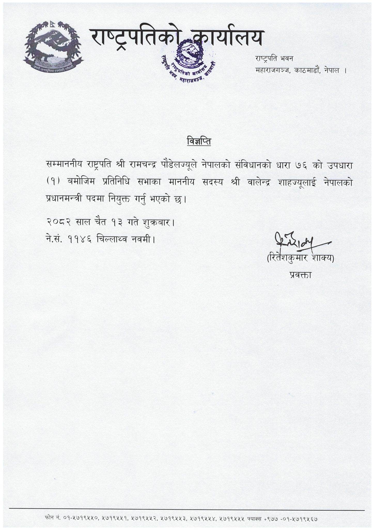 काठमाडौं : राष्ट्रपति रामचन्द्र पौडेलबाट प्रधानमन्त्रीमा नियुक्त बालेन्द्र शाहले केहीबेरपछि शपथ लिँदैछन् । यससँगै उनी औपचारिक रुपमा नेपालको शासनको बागडोर सम्हाल्दै छन् । फागुन २१ को प्रतिनिधिसभा चुनावमा झापा ५ बाट निर्वाचित उनी संसद्को पहिलो यात्रामै प्रधानमन्त्री बनेका हुन् । नवा युवाहरूमाझ लोकप्रिय बालेनले नेपालको राजनीतिक इतिहासमा नै विरलै प्राप्त हुने करिब दुई तिहाइको एक बहुमतको सरकारको नेतृत्व गर्दैछन् । संविधानको धारा ७६ को १ अनुसार बहुमत प्राप्त दलको नेताको रुपमा उनी प्रधानमन्त्री नियुक्त भएका हुन् ।