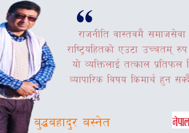 समाज सेवाको उच्चतम् रुप नै राजनीति हो । राजनीतिमा सेवाभावले होमिने हो, न कि कुनै लगानी र प्रतिफलको व्याक्तिगत हिसाब किताबले । सही गन्तव्य तय गरिएको राजनीतिले समग्र मुलुक र जनतालाई निरन्तर प्रतिफल प्रदान गरिरहेको हुन्छ । त्यही नै राजनीतिज्ञको…