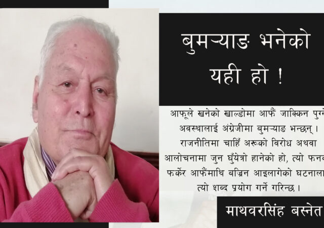आफूले खनेको खाल्डोमा आफैंं जाक्किन पुग्ने अवस्थालाई अंग्रेजीमा बुमर्‍याङ भन्छन् । राजनीतिमा चाहिँ अरूको विरोध अथवा आलोचनामा जुन घुँयेत्रो हानेको हो, त्यो फनक्क फर्केर आफैंमाथि बज्रिन आइलागेको घटनालाई त्यो शब्द प्रयोग गर्ने गरिन्छ । त्यसको ताजा उदाहरण हो, एमालेका अध्यक्ष…